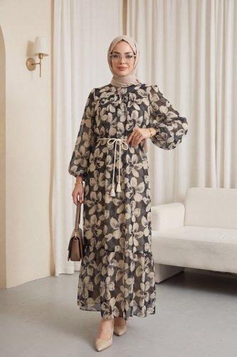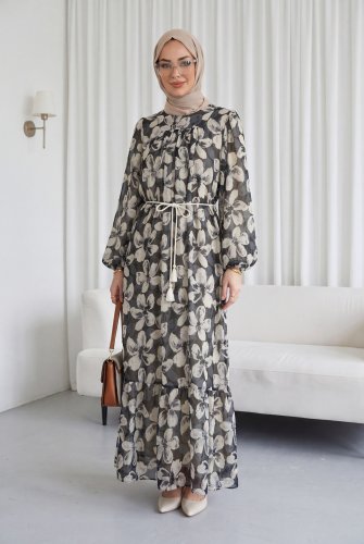 • Robadan Büzgülü Kemerli Astarlı Şifon Elbise Antrasit