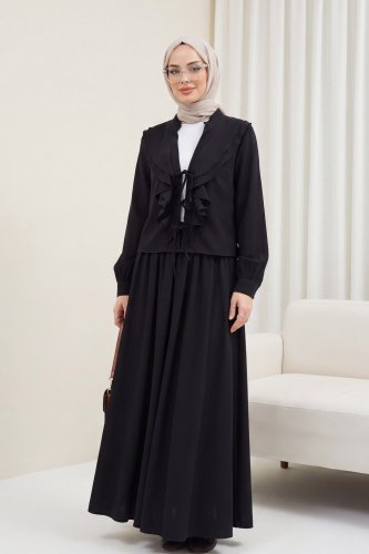 Önü Biritli Bağlamalı Volan Detaylı Etekli Modal Takım Siyah